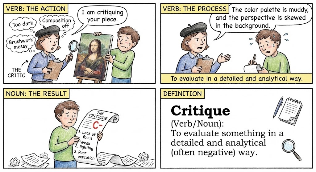 Critique (Verb/Noun): To evaluate something in a detailed and analytical (often negative) way.