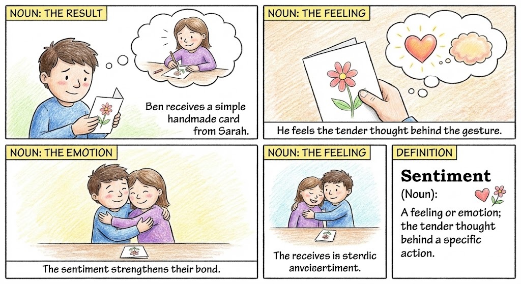 Sentiment (Noun): A feeling or emotion; the tender thought behind a specific action.