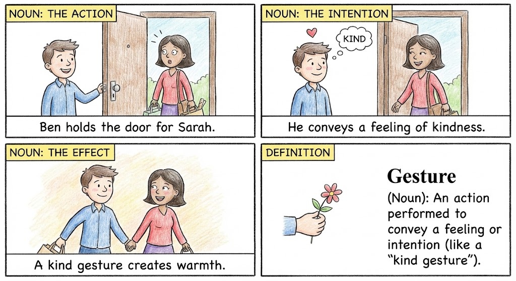 Gesture (Noun): An action performed to convey a feeling or intention (like a “kind gesture”).