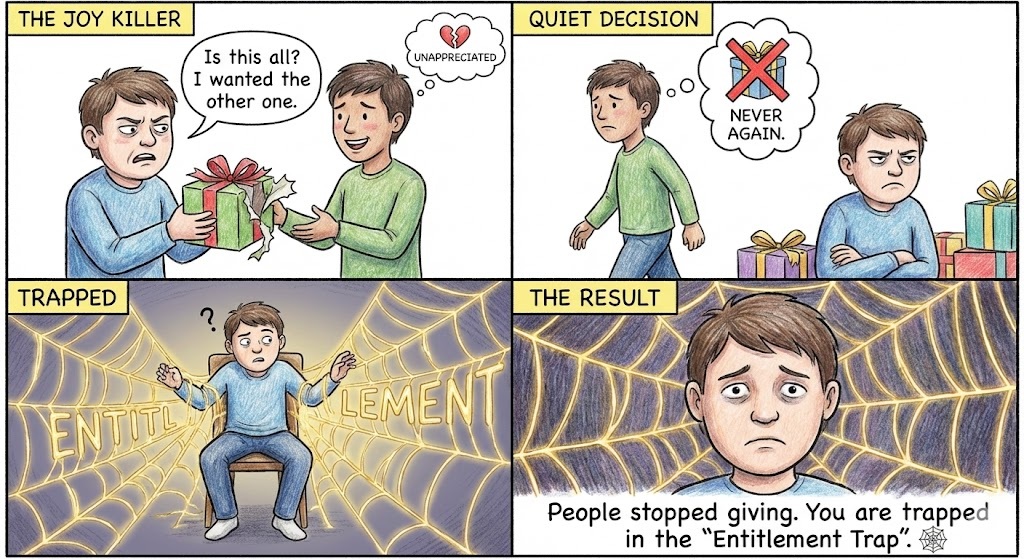 The Result? You kill the joy of giving. People feel unappreciated and quietly decide never to go out of their way for you again. You are trapped in the “Entitlement Trap.” 🕸️