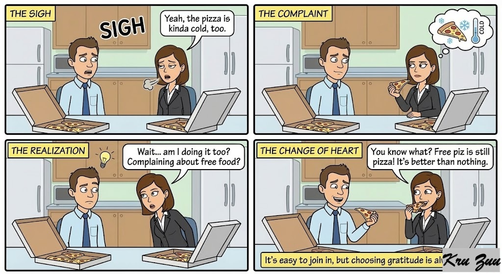 Employee 1: “I can’t believe the company only ordered pizza for our free Friday lunch. I wanted sushi.”