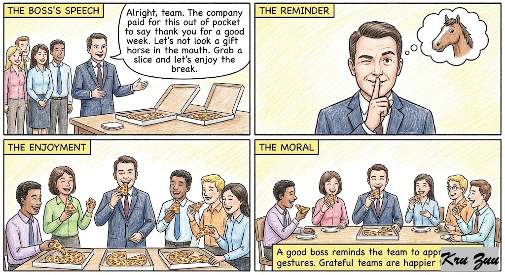 Boss: “Alright, team. The company paid for this out of pocket to say thank you for a good week. Let’s not look a gift horse in the mouth. Grab a slice and let’s enjoy the break.”