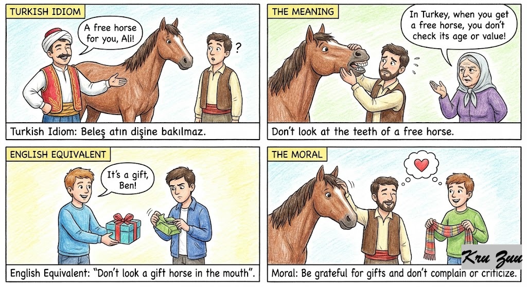 🇹🇷 Turkish: “Beleş atın dişine bakılmaz.” (Don’t look at the teeth of a free horse).