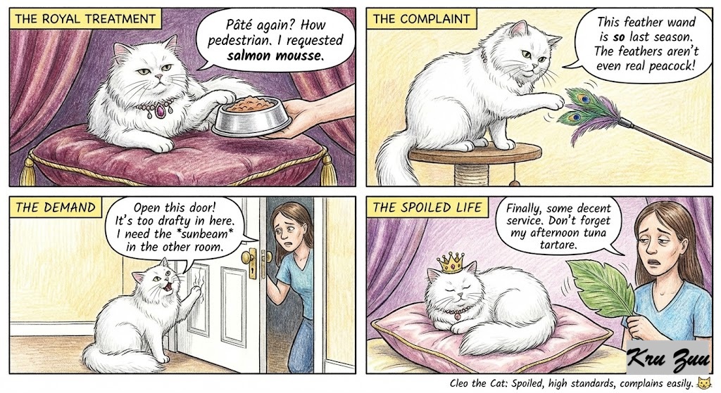 Spoiled, has very high standards, complains easily. 😼