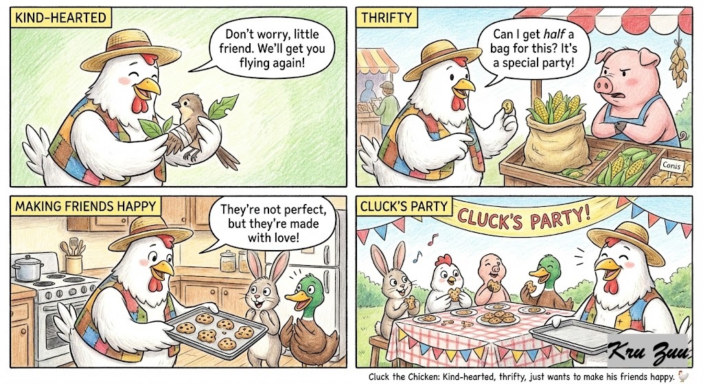 Cluck the Chicken: Kind-hearted, thrifty, just wants to make his friends happy. 🐔