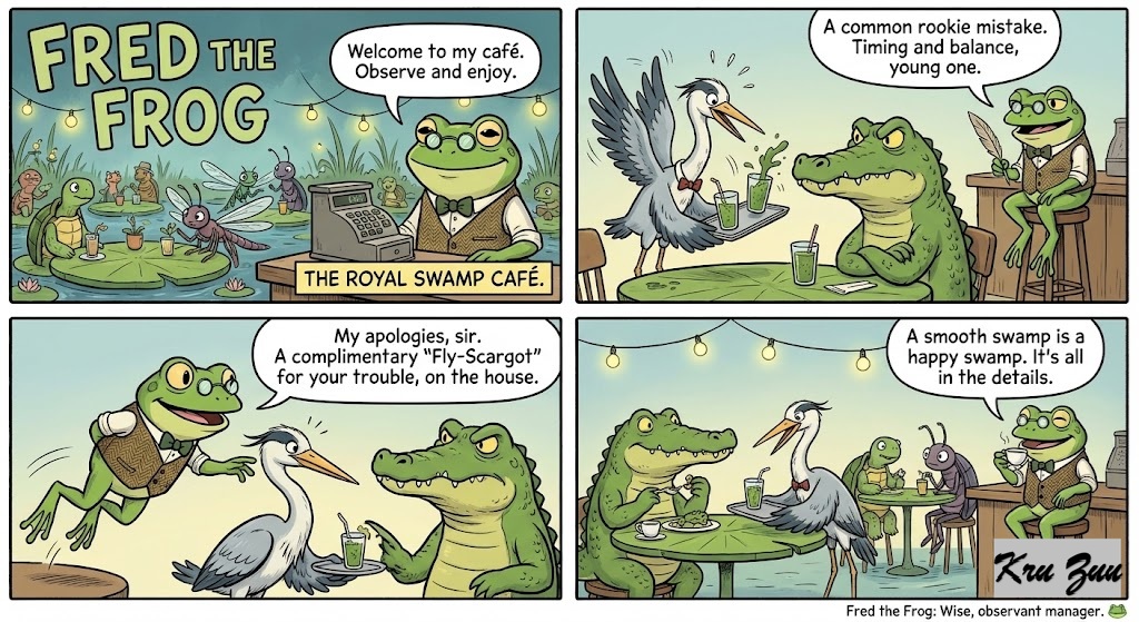Fred the Frog: The wise, observant manager of the Royal Swamp Café. 🐸