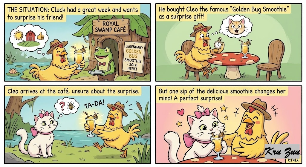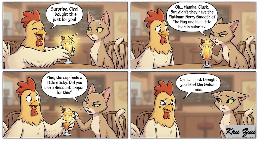 The Conflict: Cleo arrives, and Cluck slides the glowing drink across the table. “Surprise, Cleo! I bought this just for you!” Cleo squints at the smoothie, leans in, and sniffs it. “Oh… thanks, Cluck. But didn’t they have the Platinum Berry Smoothie? The Bug one is a little high in calories. Plus, the cup feels a little sticky. Did you use a discount coupon for this?” Cluck’s feathers instantly droop. His excited smile fades. “Oh. I… I just thought you liked the Golden one.”
