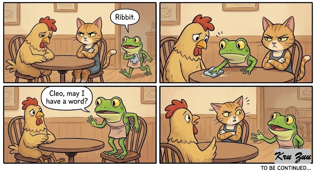 The Reaction: Fred the Frog hops over, wiping down the adjacent table. He looks at Cluck’s sad face and Cleo’s critical glare. “Ribbit,” says Fred. “Cleo, may I have a word?”
