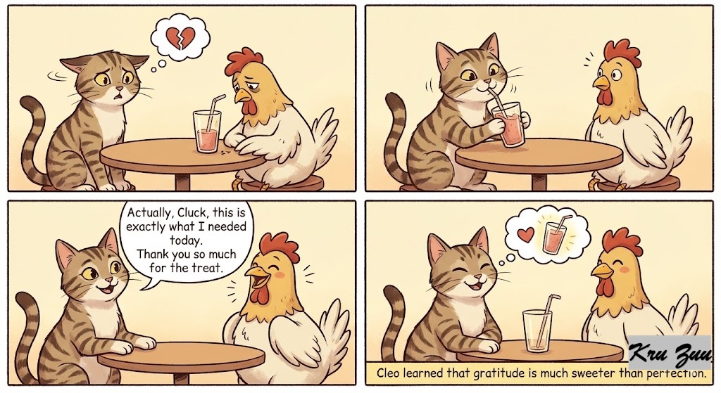 The Resolution: Cleo’s ears flatten in realization. She sees how sad Cluck looks. She quickly pulls the smoothie close, takes a big sip, and smiles. “Actually, Cluck, this is exactly what I needed today. Thank you so much for the treat.” Cluck beams with pride. Cleo learned that gratitude is much sweeter than perfection.