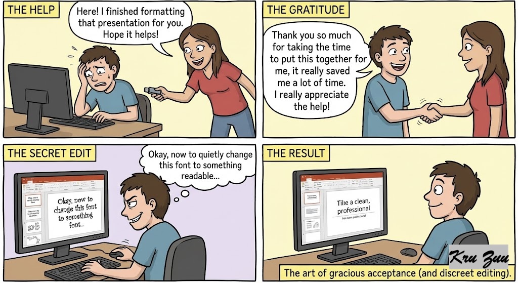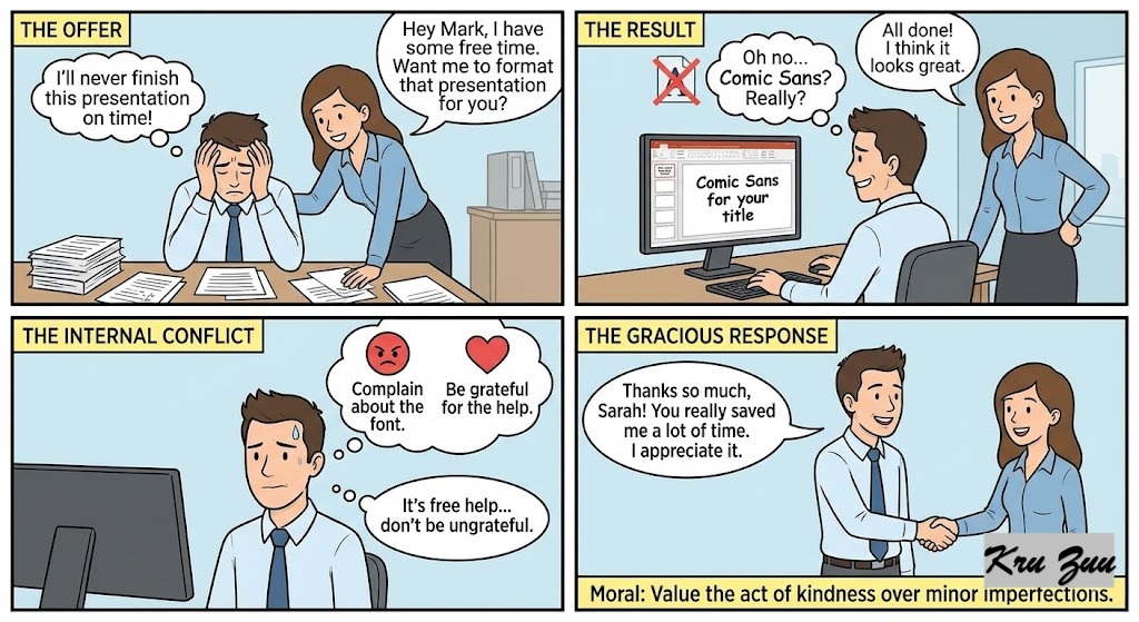 Situation: A coworker offers to format a presentation for you. They do it for free to help you out, but they use a font you don’t really like.