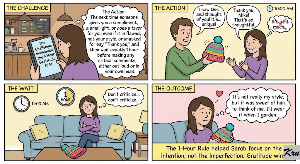 Implement the 1-Hour Gratitude Rule. The Action: The next time someone gives you a compliment, a small gift, or does a favor for you even if it is flawed, not your style, or unasked for say “Thank you,” and then wait exactly 1 hour before making any critical comments, either out loud or in your own head.