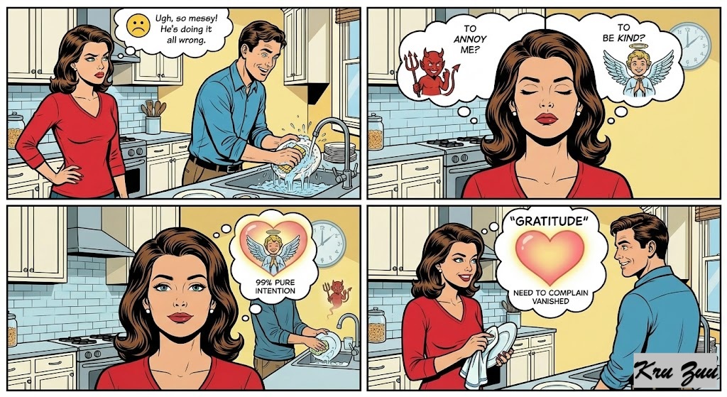 Ask yourself: “Did they do this to annoy me, or did they do this to be kind?” 99% of the time, within that hour, you will realize the gesture was pure, and your need to complain will vanish.