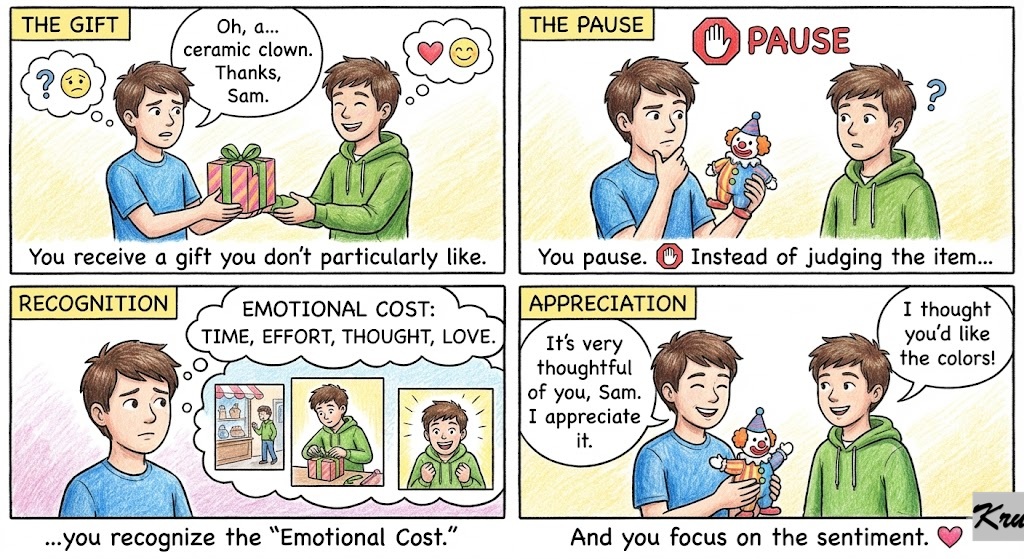 You receive a gift even one you don’t particularly like. You pause. 🛑 Instead of judging the item, you recognize the “Emotional Cost.”