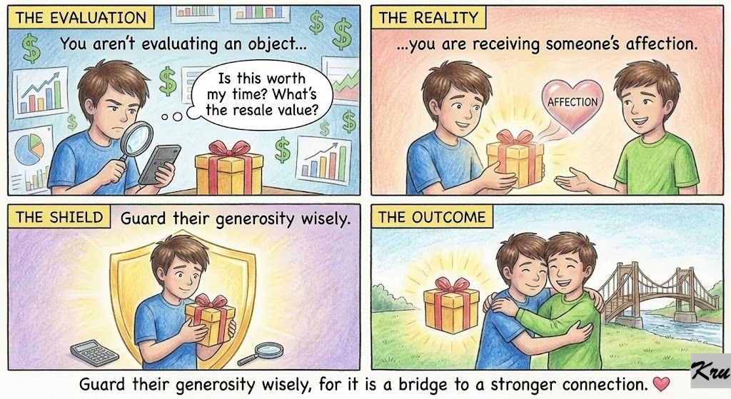 You aren’t evaluating an object; you are receiving someone’s affection. Guard their generosity wisely.