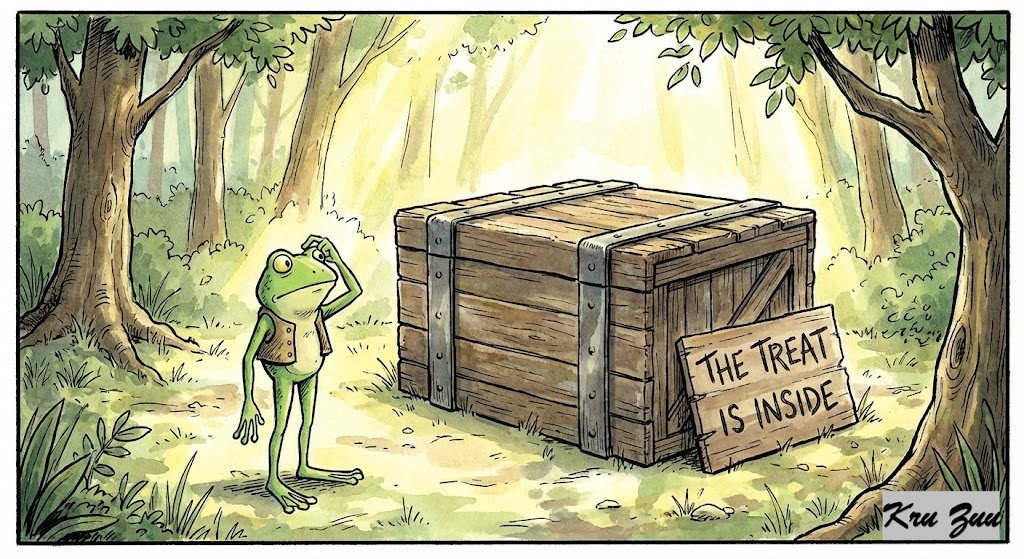 The Situation: Fred the Frog has placed a mysterious, heavy wooden box in the middle of the clearing. It has no keyhole. It has no handle. Just a sign that says: “The treat is inside.”