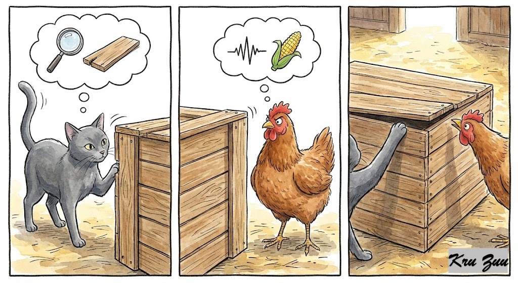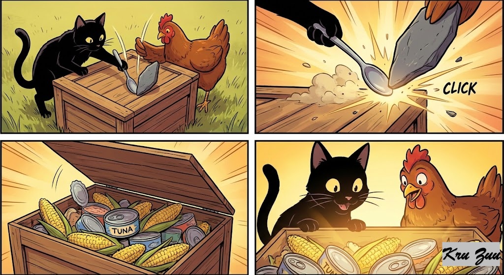 The Conflict: Cleo circles the box, analyzing the wood grain. She thinks hard. “The wood is loose on the top right corner. I need something thin to pry it open.” Cluck stares at the box, thinking about the corn inside. He feels a vibration. “The top right corner looks weak. I need something flat to poke it.”