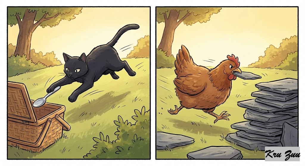 The Climax: Without saying a word to each otherβ¦ Cleo runs to the left and grabs a flat, silver spoon from a picnic basket. π₯ Cluck runs to the right and grabs a flat, loose slate of rock. πͺ¨