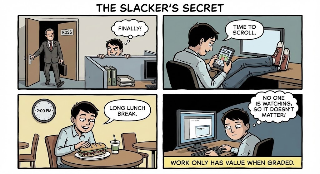 You wait for the boss to leave the office. The moment the door clicks shut, you open social media. You take a two-hour lunch. You slack off on your project. You think: “No one is watching, so it doesn’t matter!” You act as if your work only has value when somebody is grading it.