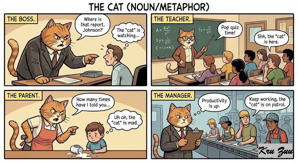 The Cat (Noun/Metaphor): The authority figure (boss, parent, teacher, manager).
