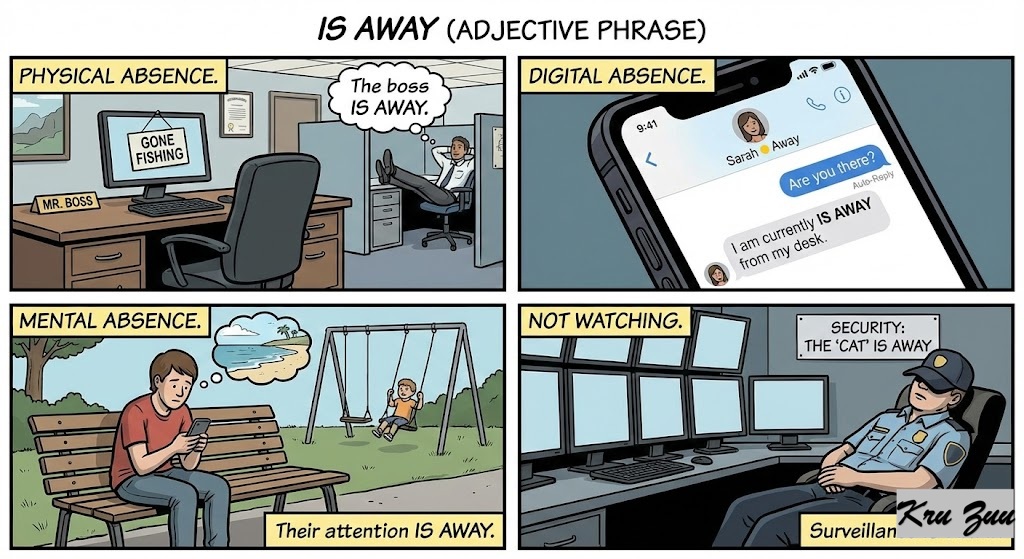 Is Away (Adjective Phrase): Absent; not currently watching.