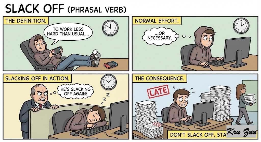 Slack off (Phrasal Verb): To work less hard than is usual or necessary.
