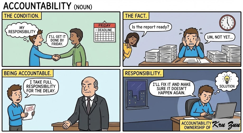 Accountability (Noun): The fact or condition of being accountable; responsibility.