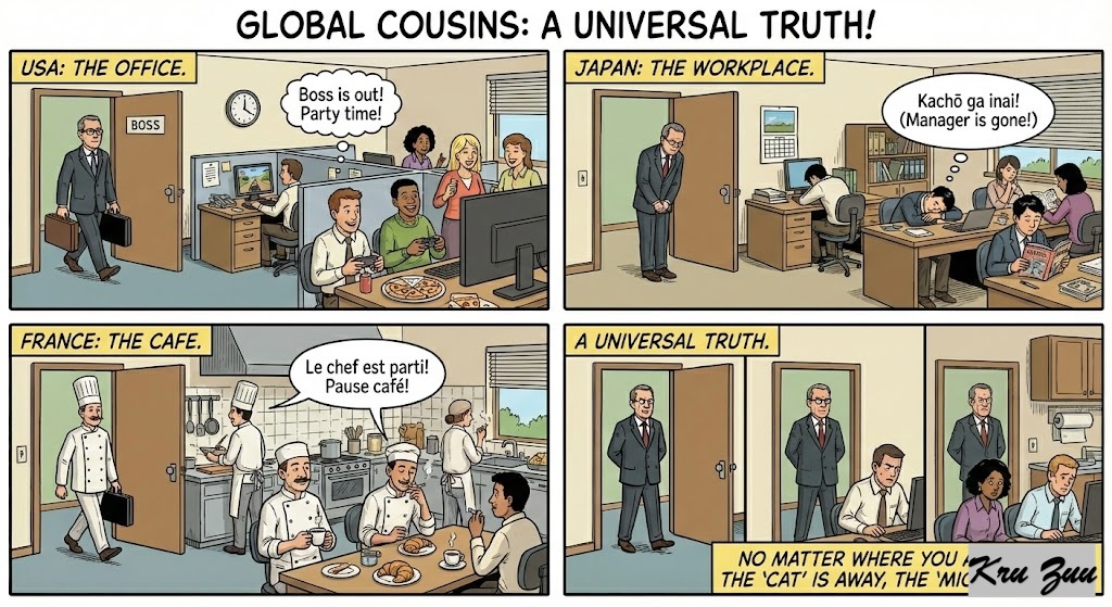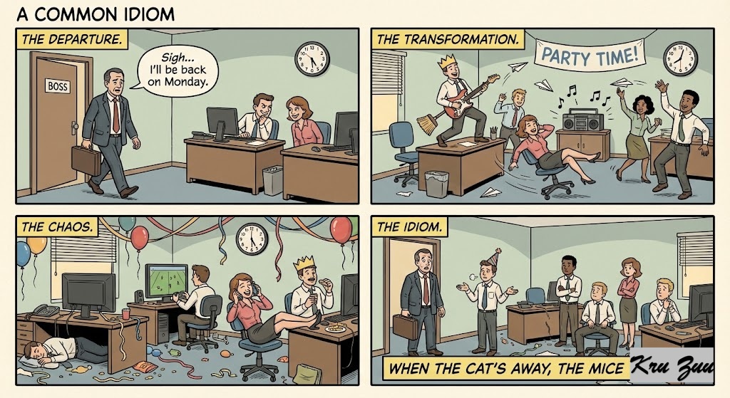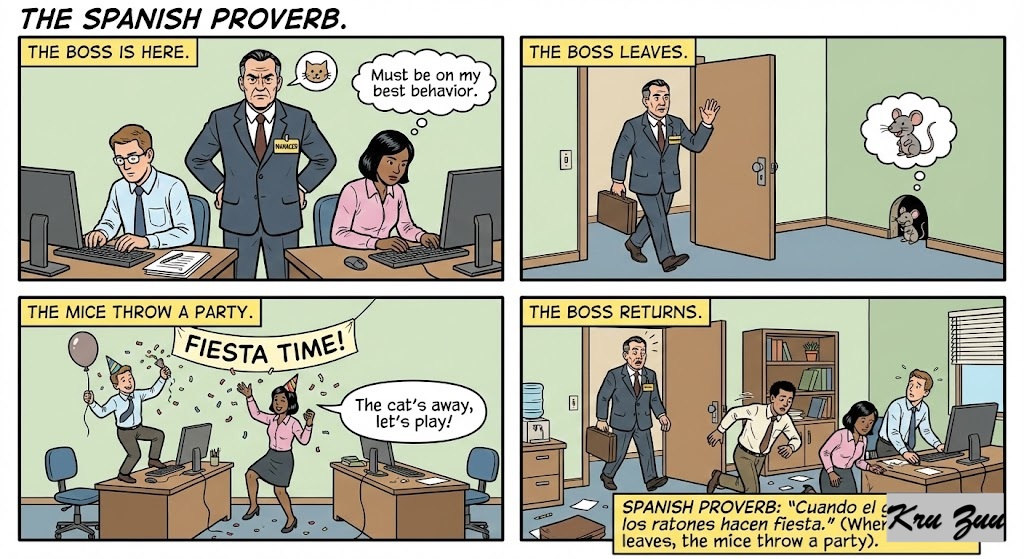 🇪🇸 Spanish:“Cuando el gato se va, los ratones hacen fiesta.” (When the cat leaves, the mice throw a party).