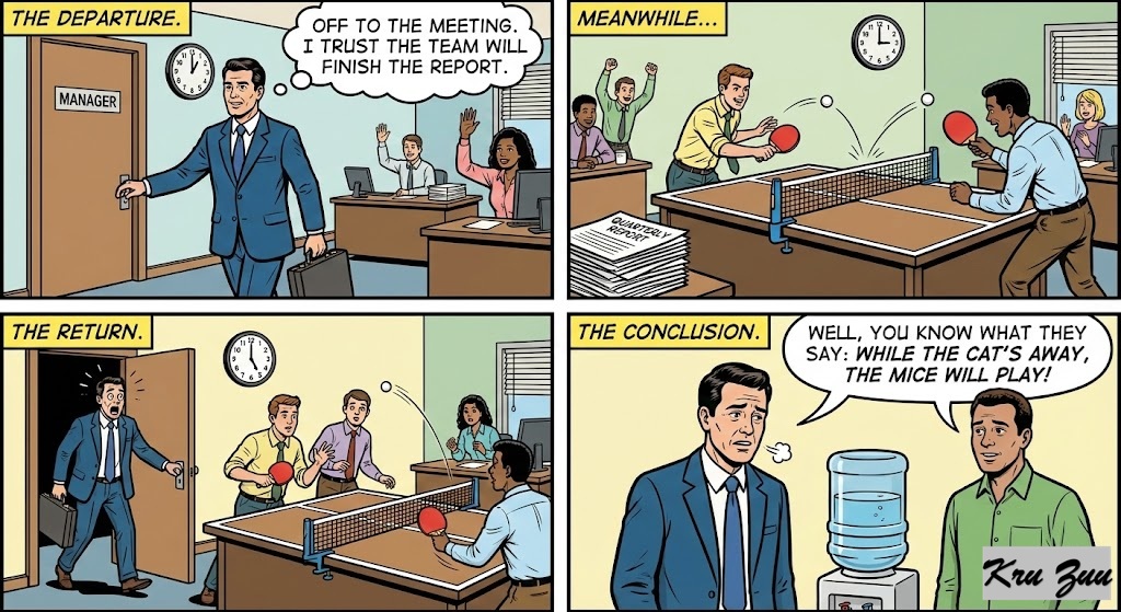 “I left the team alone for one afternoon to attend a meeting, and I came back to find them playing ping-pong instead of finishing the quarterly report. Well, you know what they say: while the cat’s away, the mice will play!”