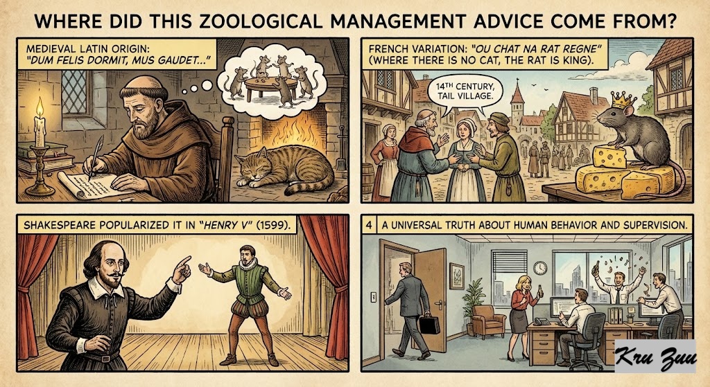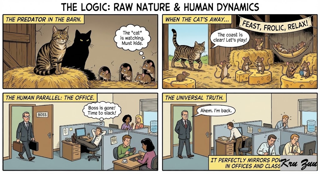 The Logic: It is based on raw nature. Cats are predators; mice are prey. When the predator leaves the barn, the prey comes out of the walls to feast, frolic, and relax without fear. It perfectly mirrors human power dynamics in offices and classrooms.