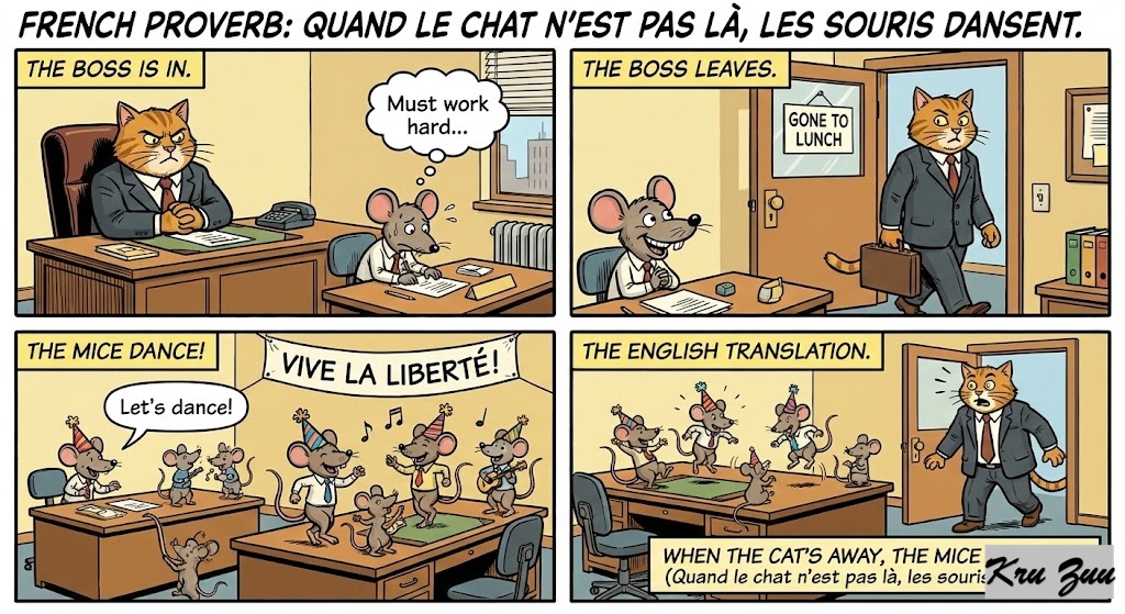 🇫🇷 French:“Quand le chat n’est pas là, les souris dansent.” (When the cat is not there, the mice dance).