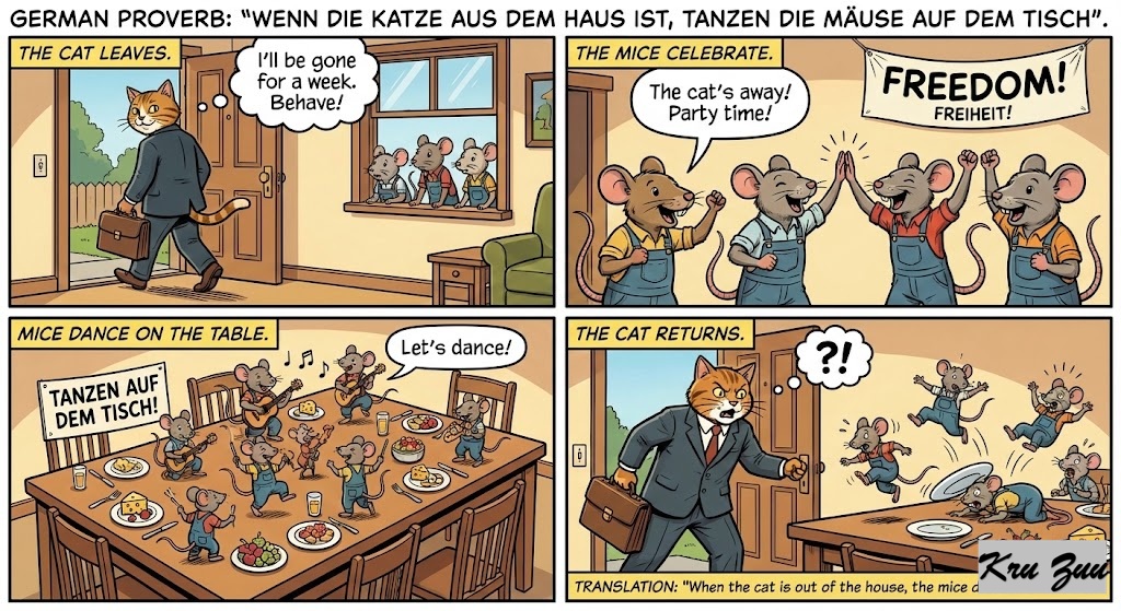 🇩🇪 German:“Wenn die Katze aus dem Haus ist, tanzen die Mäuse auf dem Tisch.” (When the cat is out of the house, the mice dance on the table).