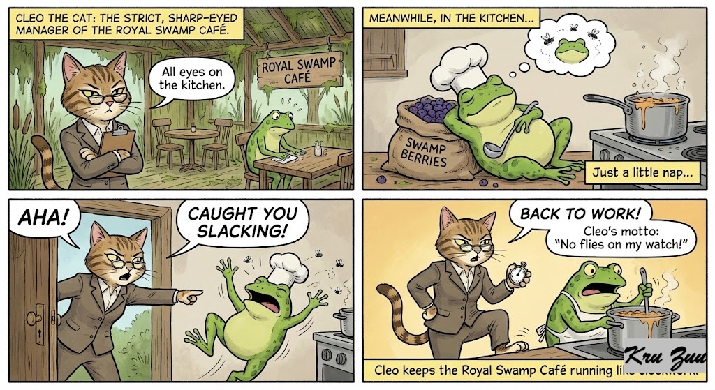 Cleo the Cat: The strict, sharp-eyed manager of the Royal Swamp Café. 😼