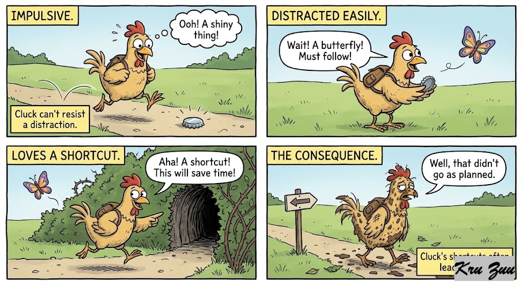 Cluck the Chicken: Impulsive, gets distracted easily, loves a shortcut. 🐔