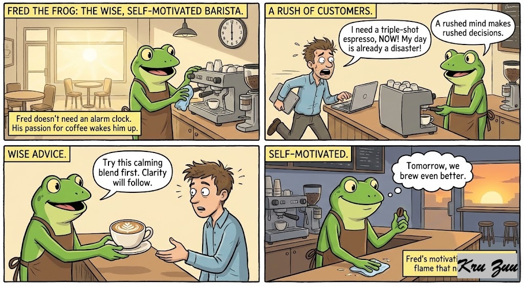 Fred the Frog: The wise, green, self-motivated barista. 🐸