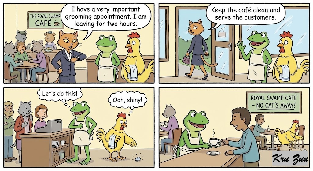 The Situation: It is a busy Tuesday at the Royal Swamp Café. Cleo the Cat looks at her watch. “I have a very important grooming appointment,” she announces. “Fred, Cluck, I am leaving for two hours. Keep the café clean and serve the customers.” Cleo walks out the door.
