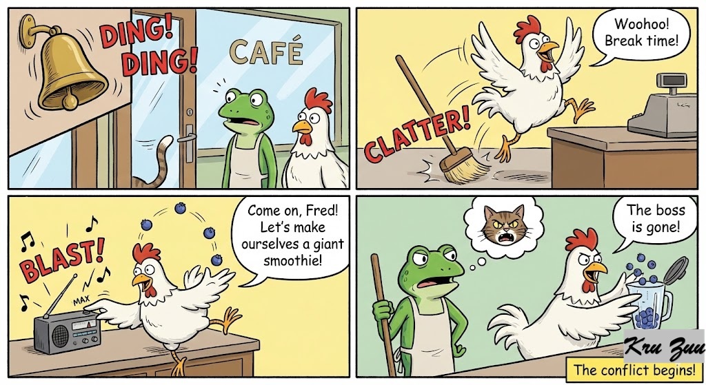 The Lesson: Fred turns to the panicking chicken. “Ribbit,” says Fred calmly. “Cluck, take a deep breath.” “But the kitchen is a disaster!” Cluck squawks, pointing at the sticky counters. Fred nods. “Yes, it is currently a mess. But we are about to win the Best Café Award for this drink. As the humans say, you can’t make an omelet without breaking eggs… or in this case, you can’t make the Ultimate Golden Smoothie without squashing a few berries. We will clean the kitchen later. Let Cleo create.”