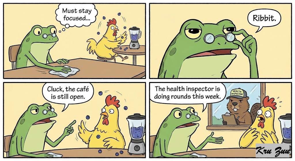 The Reaction: Fred doesn’t stop wiping the tables. He adjusts his glasses. “Ribbit,” says Fred. “Cluck, the café is still open. The health inspector is doing rounds this week.”