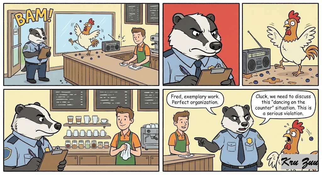 The Lesson: Suddenly, the door flies open. It isn’t Cleo. It is Mr. Badger, the city Health Inspector. He looks at the sticky floor, the loud radio, and the chicken dancing on the counter with blueberries. Then, he looks at Fred’s perfectly organized, spotless barista station.