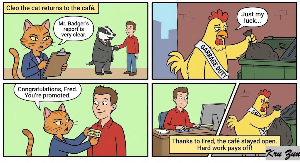 The Resolution: When Cleo returned, Mr. Badger had left a very clear report. Because of Fred’s perfect section, the café wasn’t shut down. Cluck was put on garbage duty for a month. Fred, however, was immediately promoted to Assistant Manager.