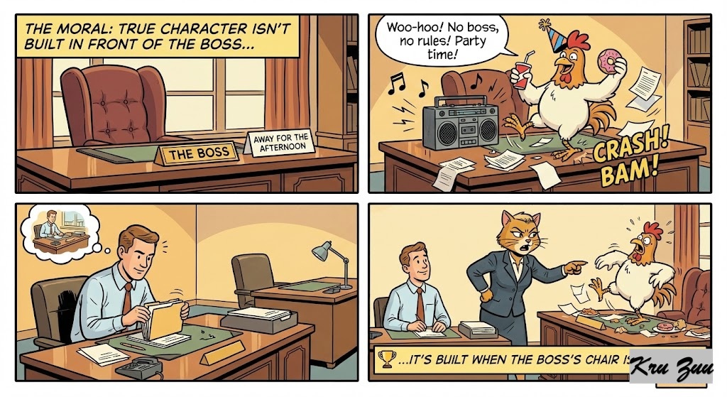 The Moral: True character isn’t built in front of the boss; it’s built when the boss’s chair is empty. 🏆