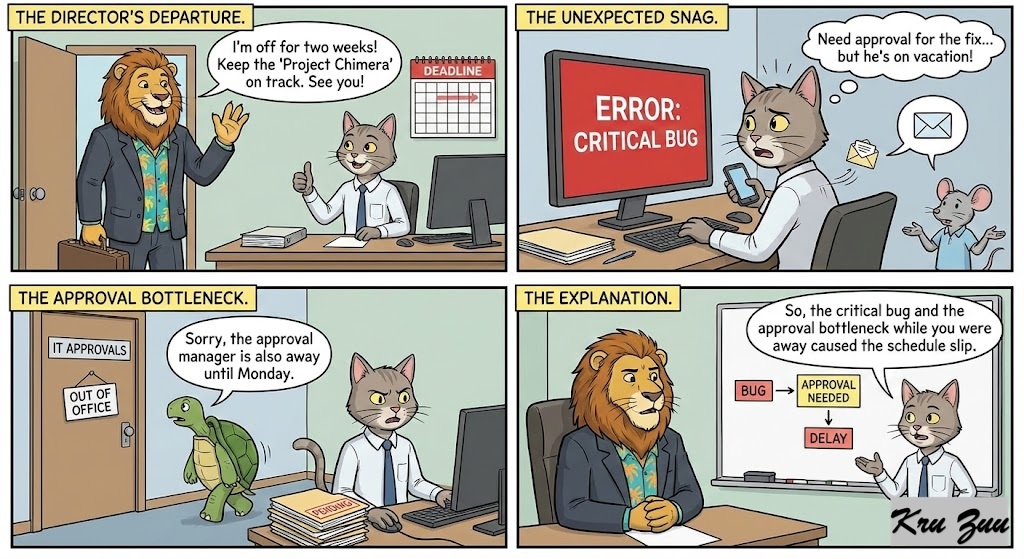 Situation: You are explaining to a senior director why a project fell behind schedule while they were on vacation.
