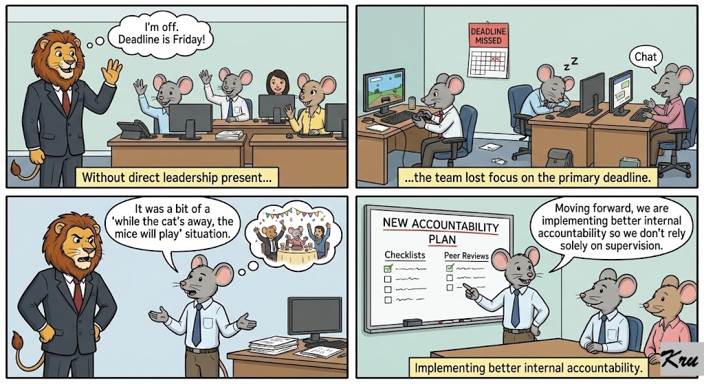 You Say: “Unfortunately, without direct leadership present, the team lost focus on the primary deadline. It was a bit of a ‘while the cat’s away, the mice will play’ situation. Moving forward, we are implementing better internal accountability so we don’t rely solely on supervision.”