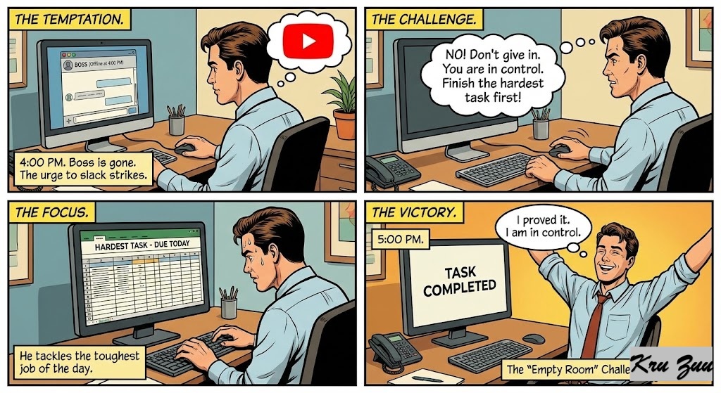 Example: If your manager goes offline on Slack at 4:00 PM on a Friday, don’t instantly open YouTube. Finish the hardest task of the day first. Prove to yourself that you are in control.