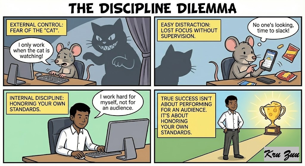 External control vs. Internal discipline. We live in a world where it is incredibly easy to get distracted the second supervision disappears. But true success isn’t about performing for an audience; it’s about honoring your own standards. If you only do the right thing when there is a threat of punishment (the “cat”), you are living like a scared mouse.